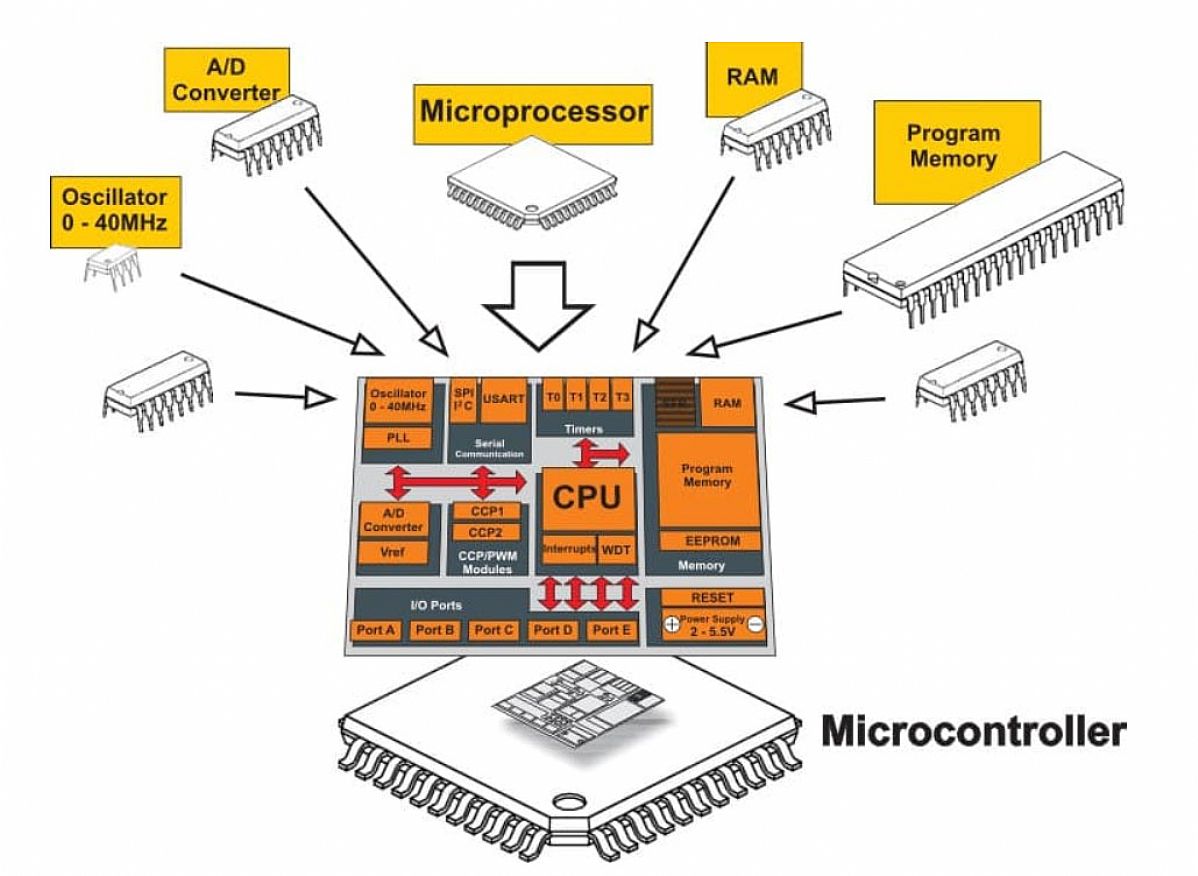 Bir mikrodenetleyici (Tek Çipli Mikrobilgisayar), geleneksel mikrobilgisayarların mimarisinden kaynaklanır. Geleneksel bir mikrobilgisayar şunlardan oluşur: